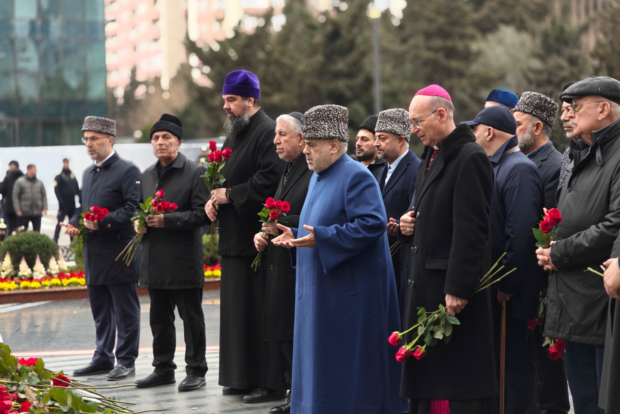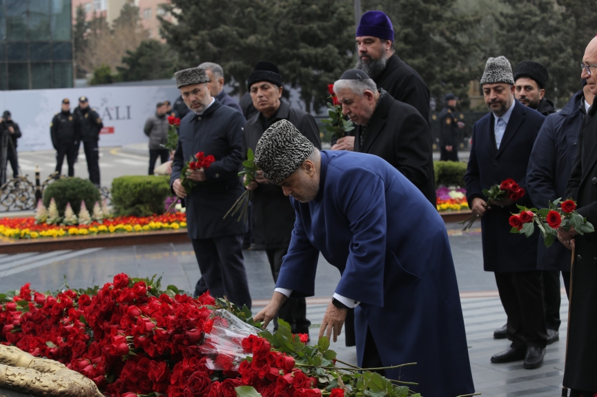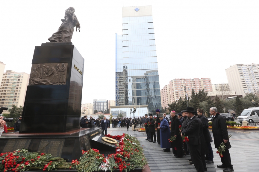 Din xadimləri XX əsrdə bəşər tarixinə Xocalı soyqırımı kimi daxil olan qanlı faciə qurbanlarının abidəsinin önünə tər çiçəklər düzüblər, faciə qurbanlarının xatirəsini ehtiramla yad edərək onların ruhları üçün dualar ediblər.